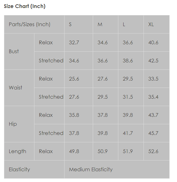 Parts/Sizes (Inch) S M L XL Bust Relax 32.7 34.6 36.6 40.6 Stretched 34.6 36.6 38.6 42.5 Waist Relax 25.6 27.6 29.5 33.5 Stretched 27.6 29.5 31.5 35.4 Hip Relax 35.8 37.8 39.8 43.7 Stretched 37.8 39.8 41.7 45.7 Length Relax 49.8 50.9 51.9 52.6 Elasticity Medium Elasticity